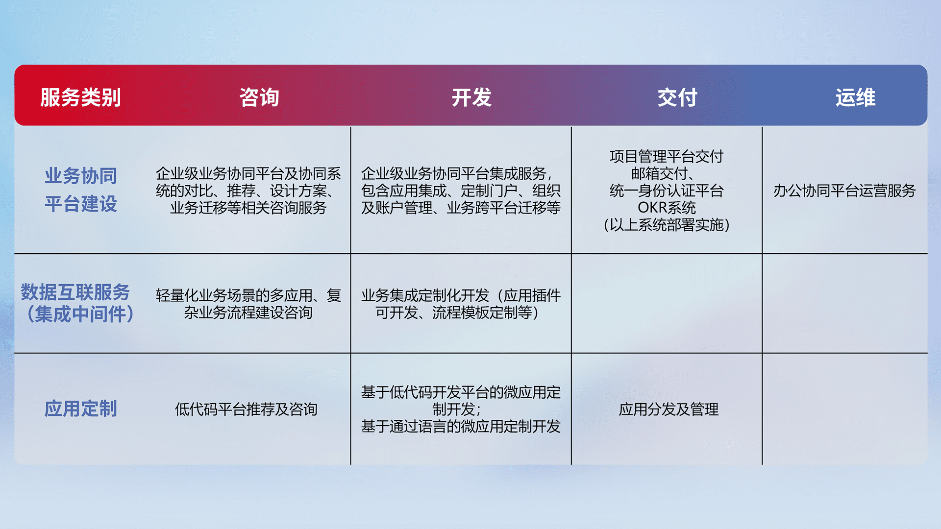 针对钉钉、、、、企微、、、IDaas等平台级产品提供产品的规划、、方案、、交付、、定制化开发等服务,,,,实现如统一协同办公、、智能客户服务、、混合会议管理、、智能数据查询、、、等业务场景,,实现数字化转型。。。
